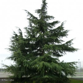 Grand arbre persistant pouvant atteindre 30 à 40 m de haut. Jeunes rameaux longs et fins, gris jaunâtre. Aiguilles vertes à bleues. Floraison en gros cônes dressés en septembre. Grand arbre persistant pouvant...
