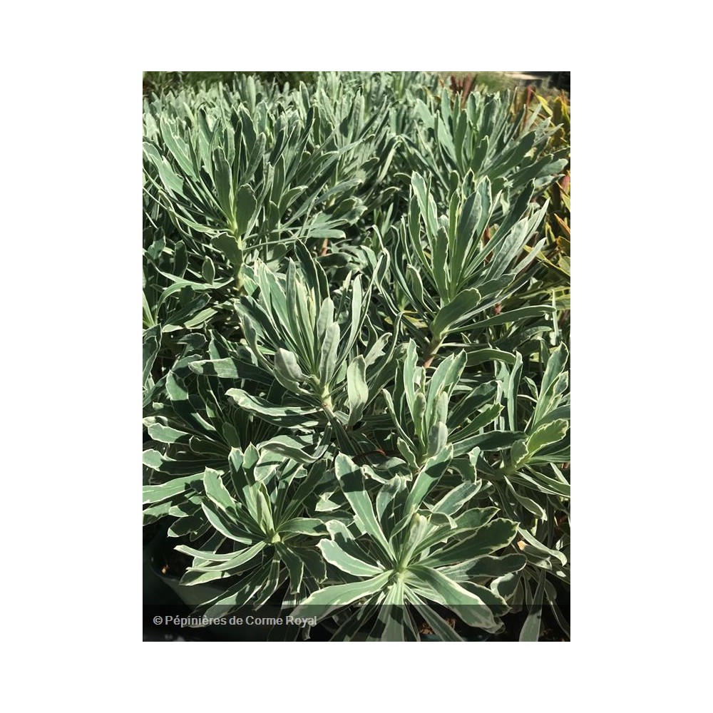 | Description | Euphorbe des vallons au port compact, au feuillage glauque, marginé de crème, lui donnant un aspect argenté. Inflorescences crème à œil pourpre. |